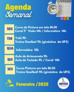 Confira a Programação Semanal da ADEVISE! 🎨🎶⚽🧘♀️ Venha participar das nossas atividades e aproveite tudo o que a ADEVISE tem a oferecer! Inclusão, aprendizado e
